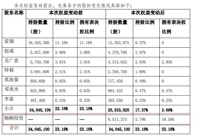 交易完成后,栩桐投资拥有表决权的比例达到19.50%,成为公司控股股东,实际控制人变更为林伟。